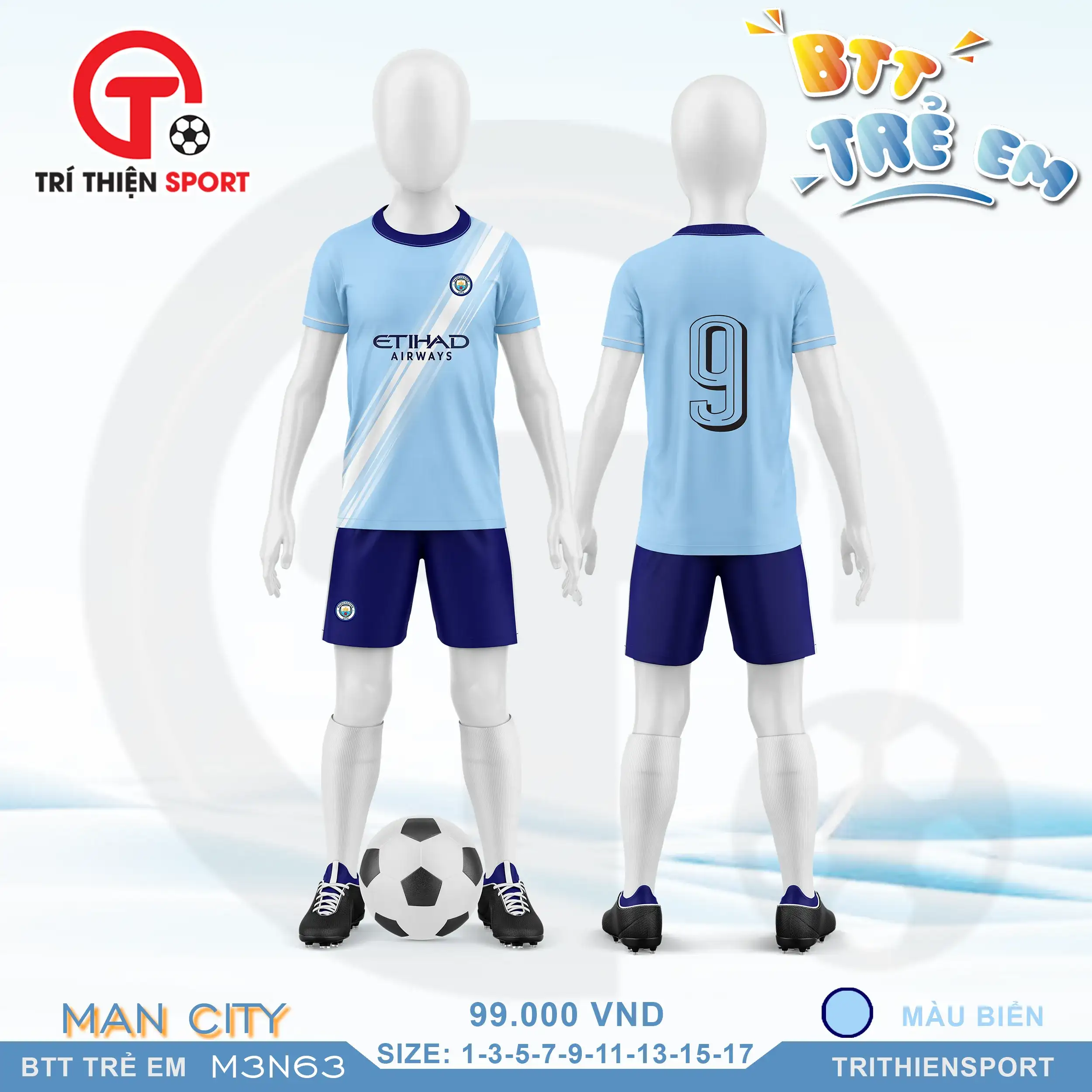 Bộ quần áo bóng đá trẻ em CLB Manchester City có đặc điểm sau: