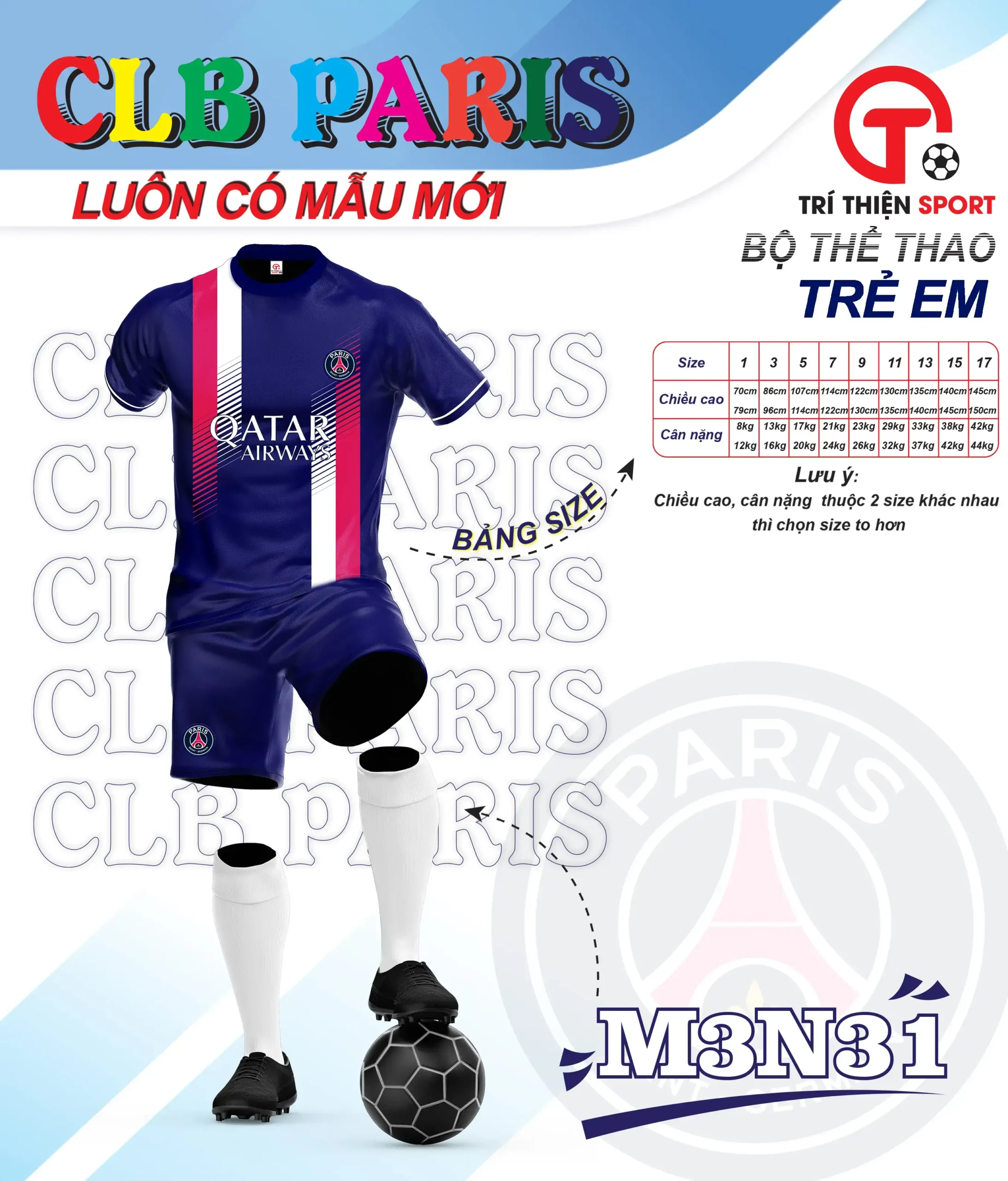 Bộ quần áo bóng đá trẻ em CLB PSG có đặc điểm sau: