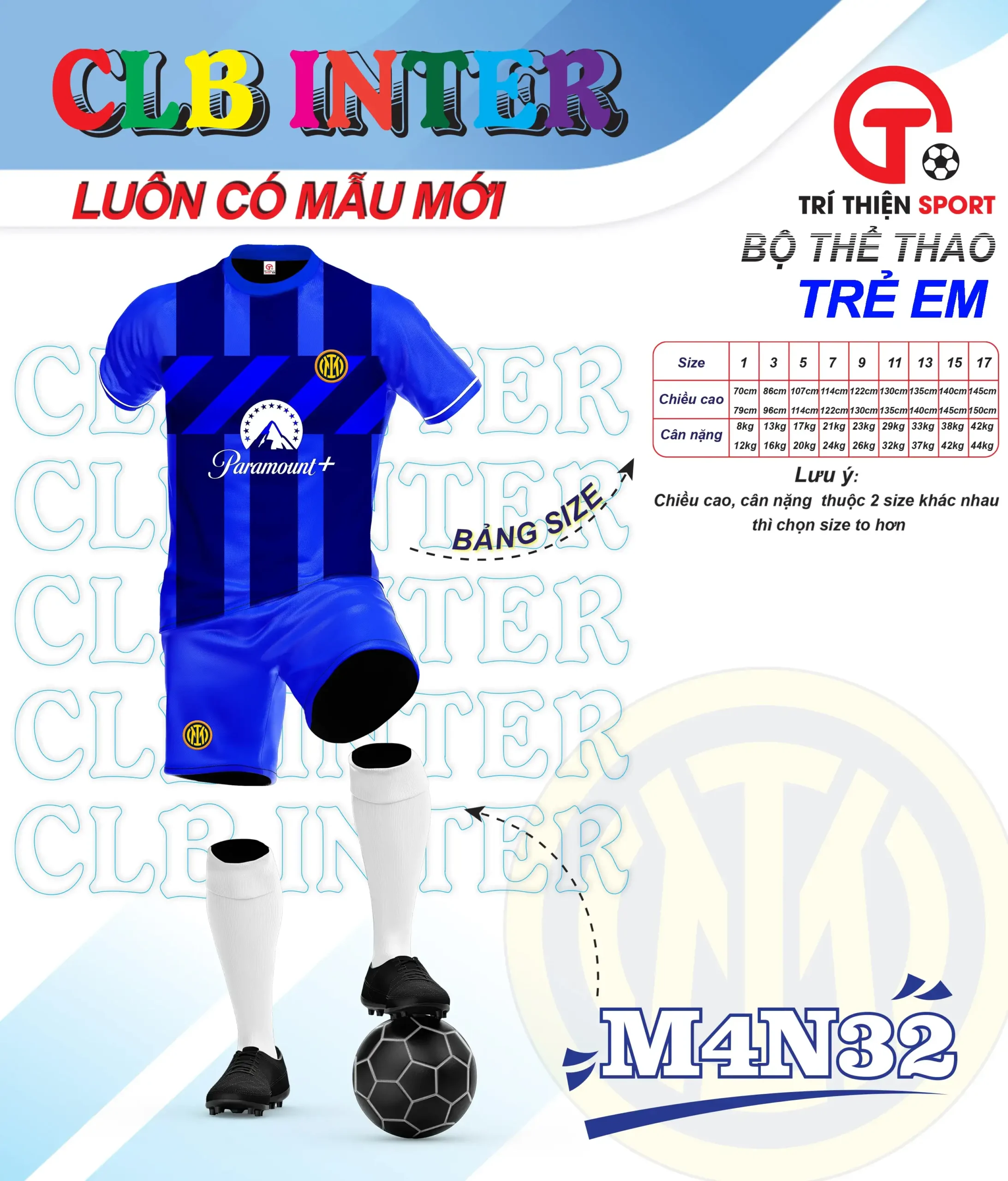 Bộ quần áo bóng đá trẻ em CLB Inter Milan có đặc điểm sau: