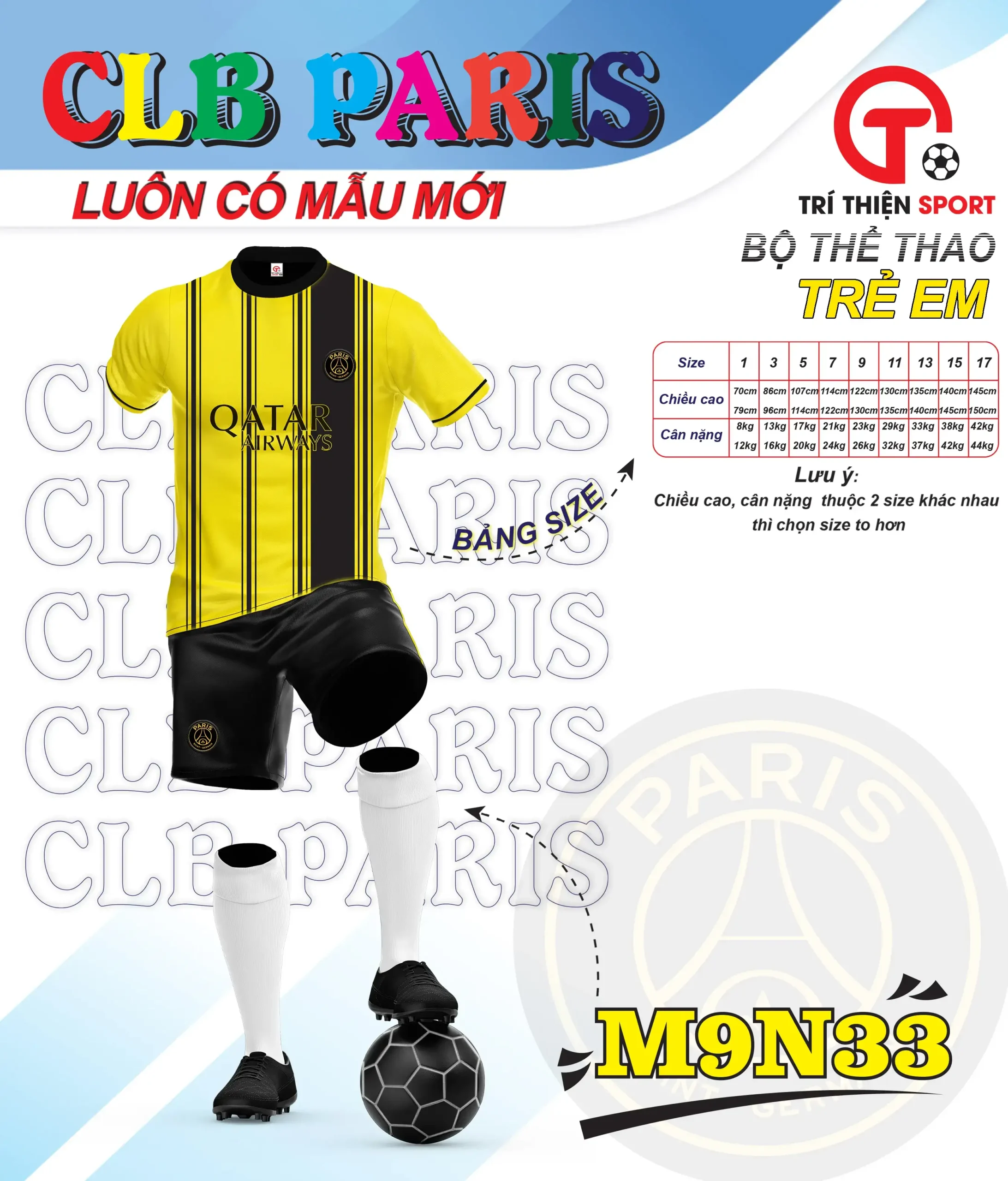 Bộ quần áo bóng đá trẻ em CLB PSG có đặc điểm sau: